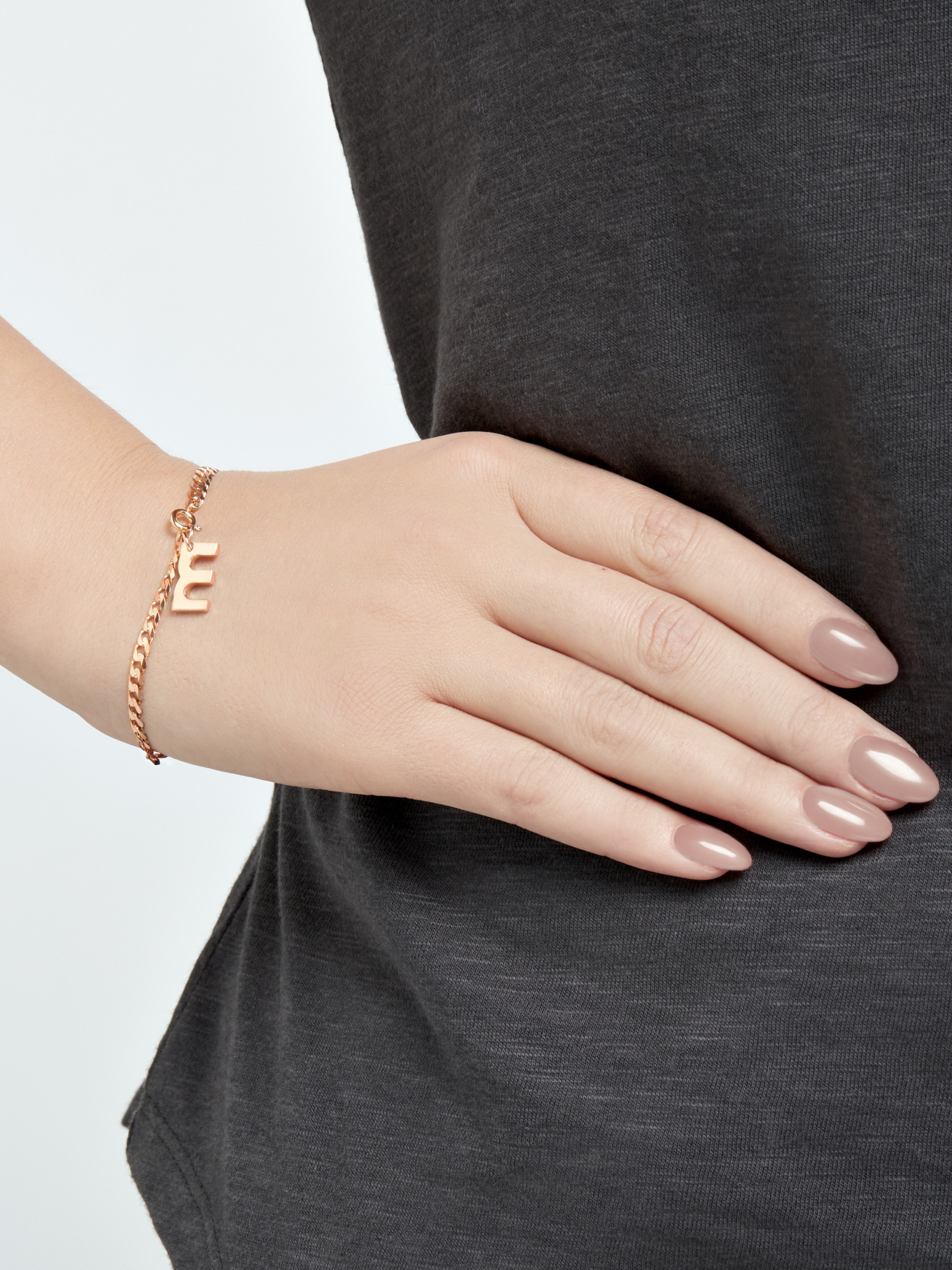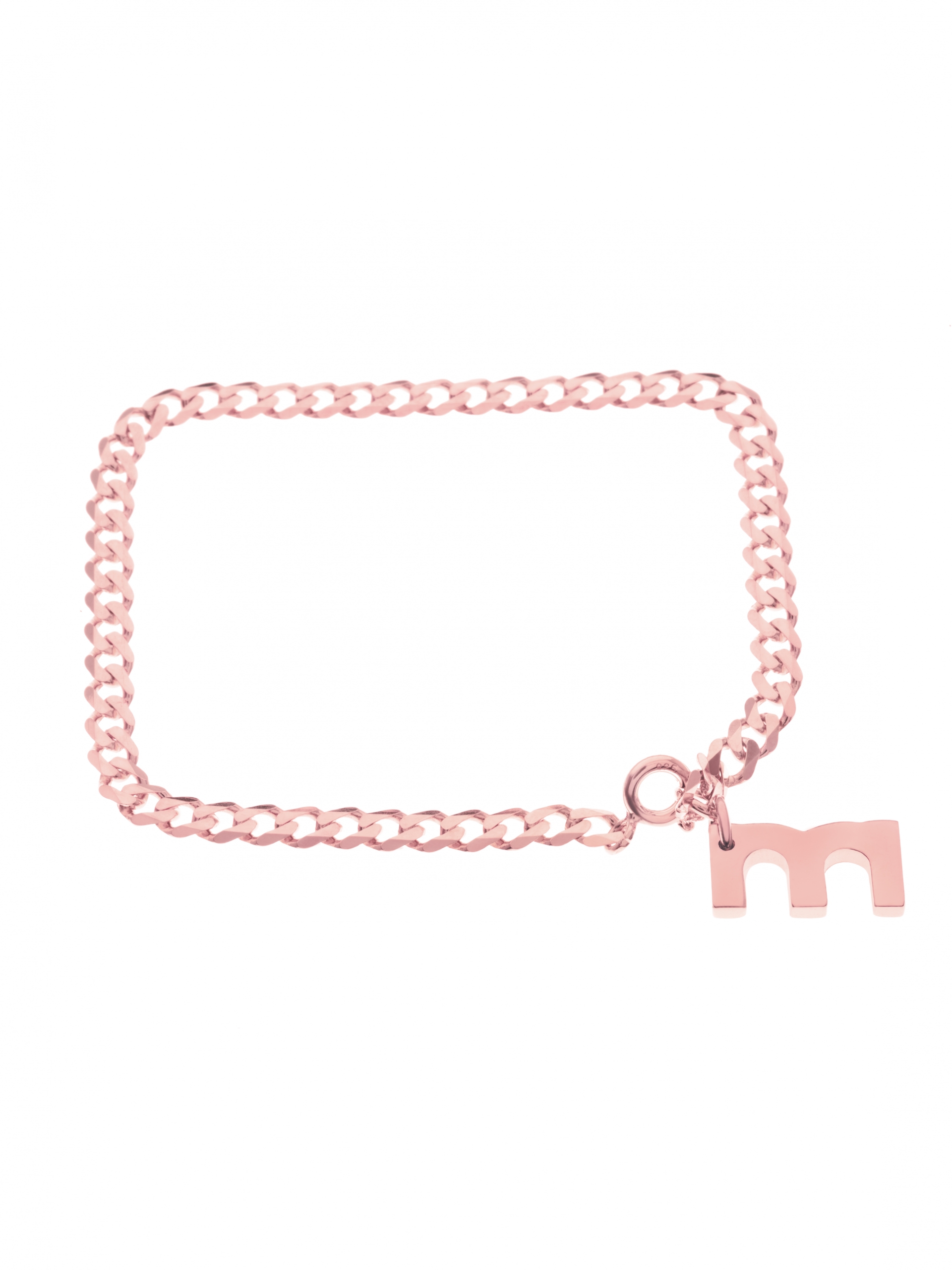 Bracelet on a thick chain with a pendant in the form of the ‘moie’ logo. The bracelet is available in 2 sizes. Size S has a length of 15cm, size M has a length of 17cm. The product is made of rose Vermeil gold.