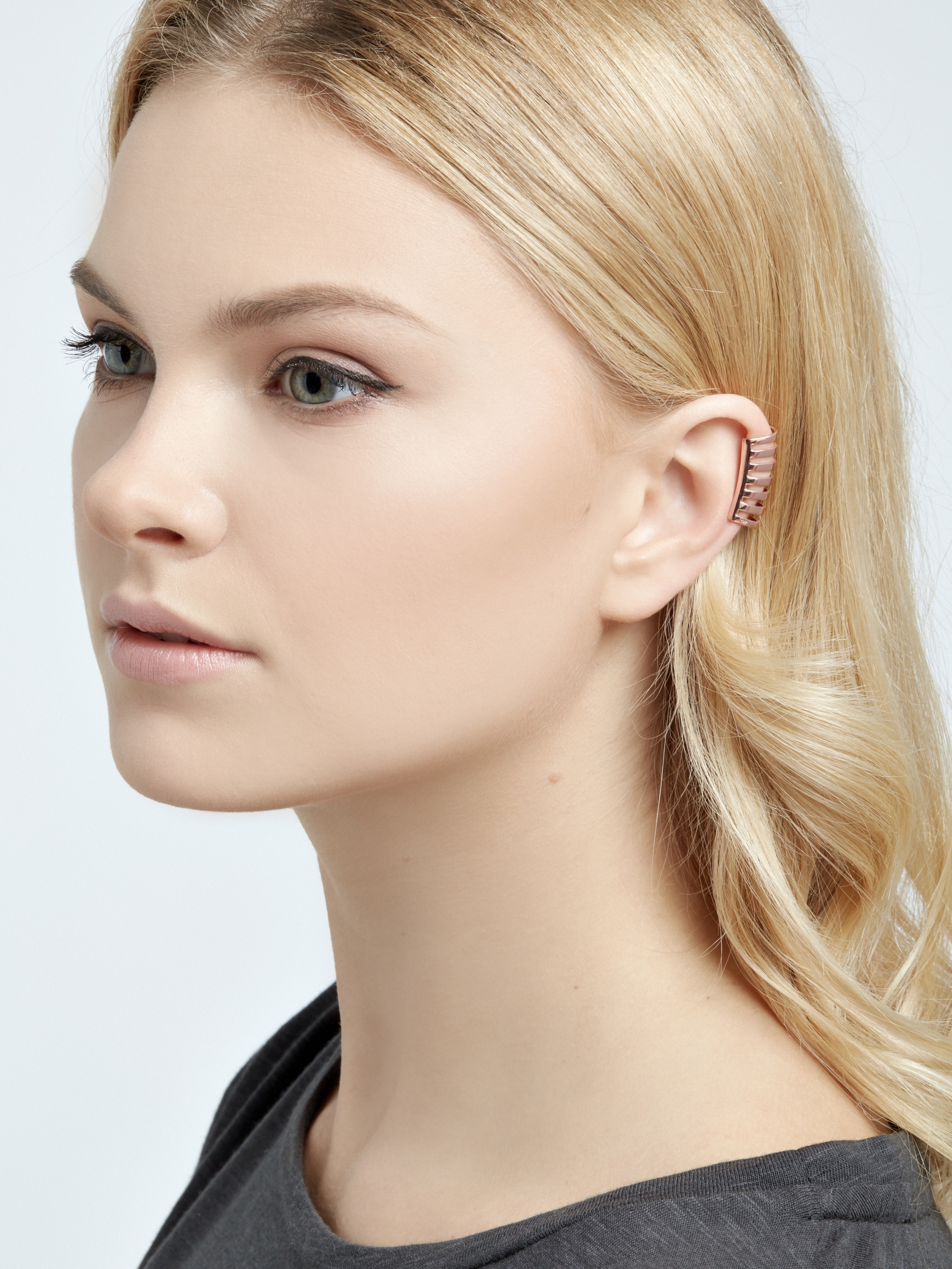 Add to WishlistEar cuff is a well-shaped, profiled element (not a plate) cut into horizontal stripes. The ear cuff is inserted by sliding it from the bottom – from the soft part of the ear. The ear cuff stays properly on the ear thanks to its shape. Length: about 2.5 cm. The ear cuff is made of Rose Vermeil gold.