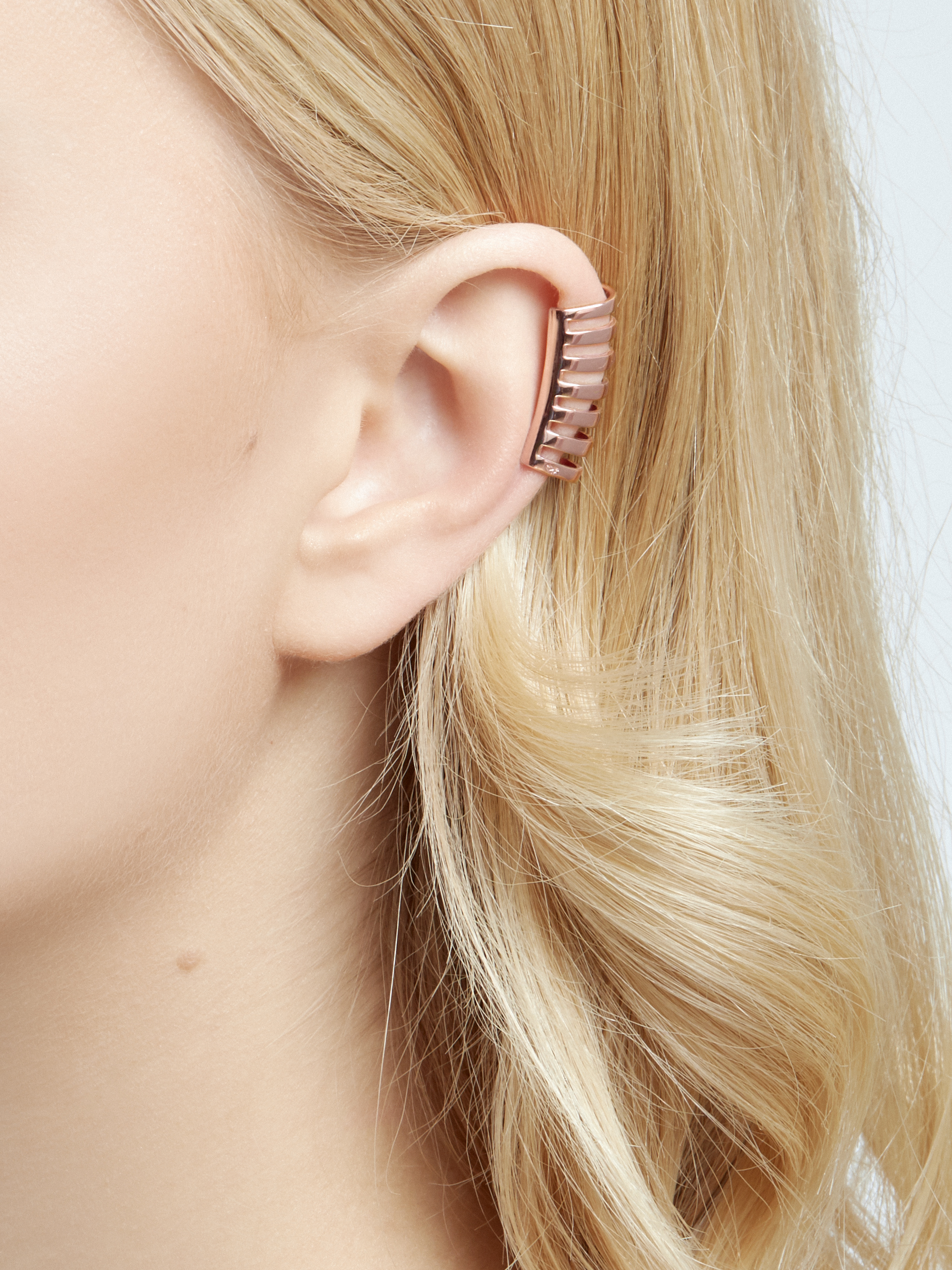 €59Ear cuff made of rose Vermeil gold. Ear cuff is made from 5 profiled elements mounted to the rack which stays on the back side of the ear. It can be worn on either left or right ear. Size of the ear cuff: 4,6 cm.made of rose Vermeil gold. Ear cuff is made from 5 profiled elements mounted to the rack which stays on the back side of the ear. It can be worn on either left or right ear. Size of the ear cuff: 4,6 cm.