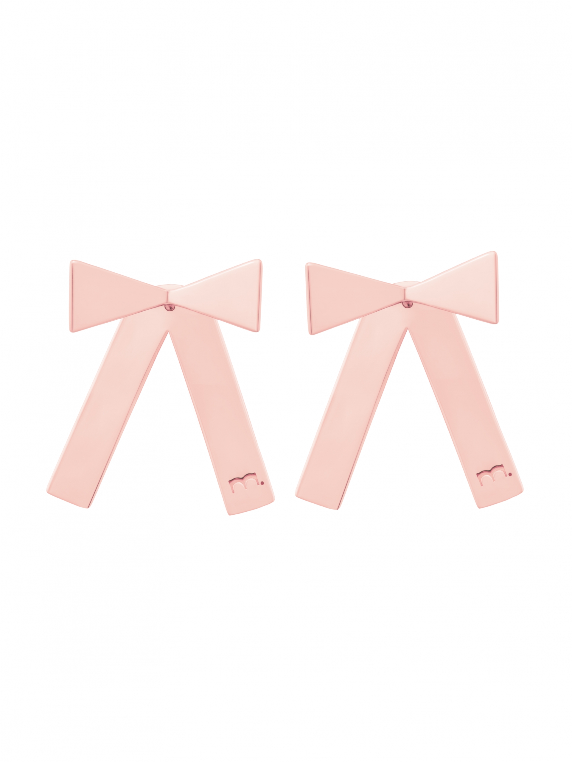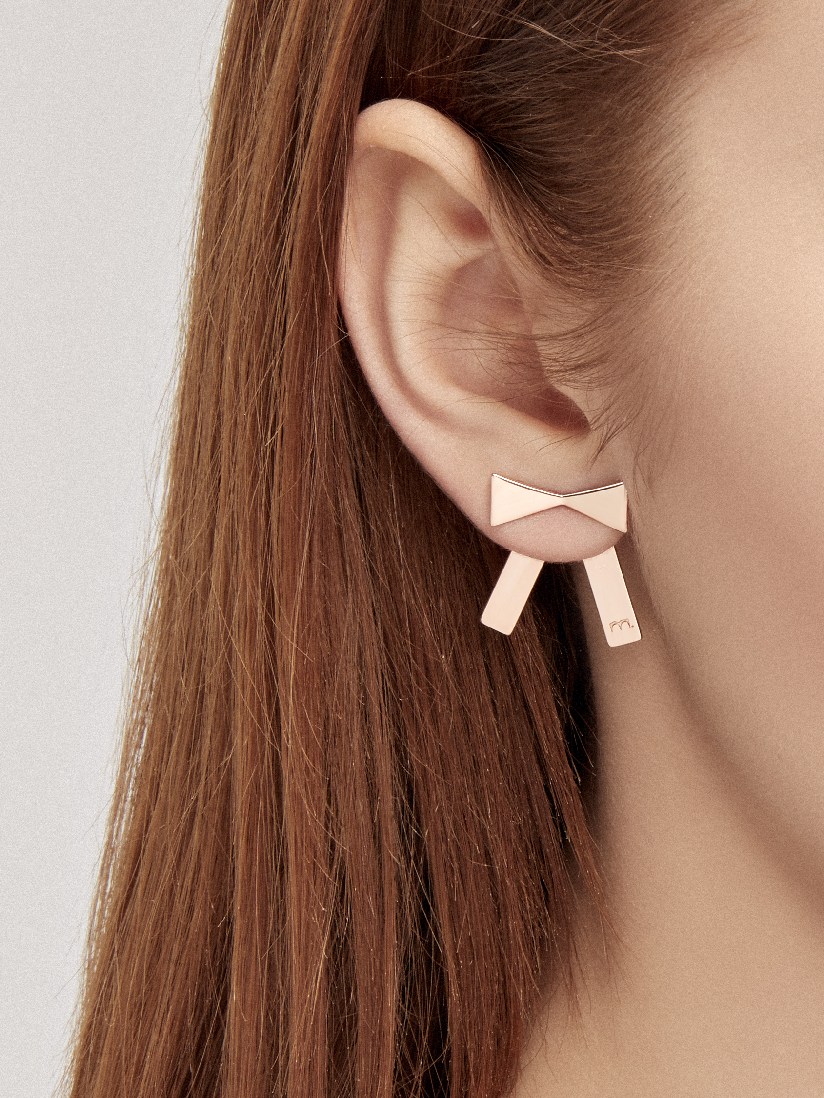 Earings made of rose Vermeil gold. Earrings consist of a pair. Each earring has two parts – that can be worn either as an ear stud with a bow or together with a ribbon mounted from the back side of the ear. Size of the earring: 2,5 cm.