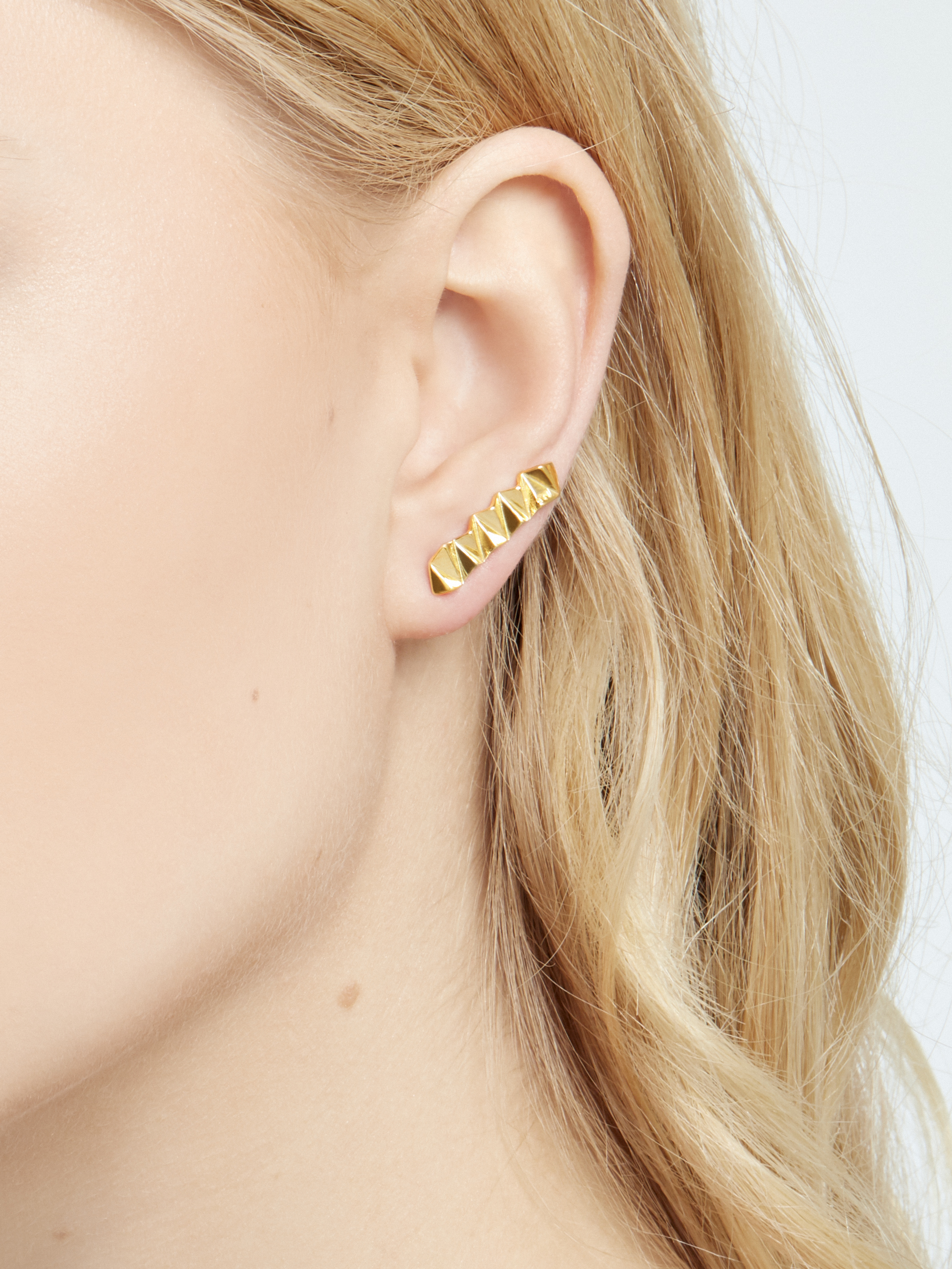 €54Earrings in the shape of a bent form resembling a folded cardboard. The earrings have guides that allow the earring to be inserted through the hole and then placed along the ear looking like an ear cuff. Dimension: 2.8 cm. The product is made of yellow Vermeil gold.