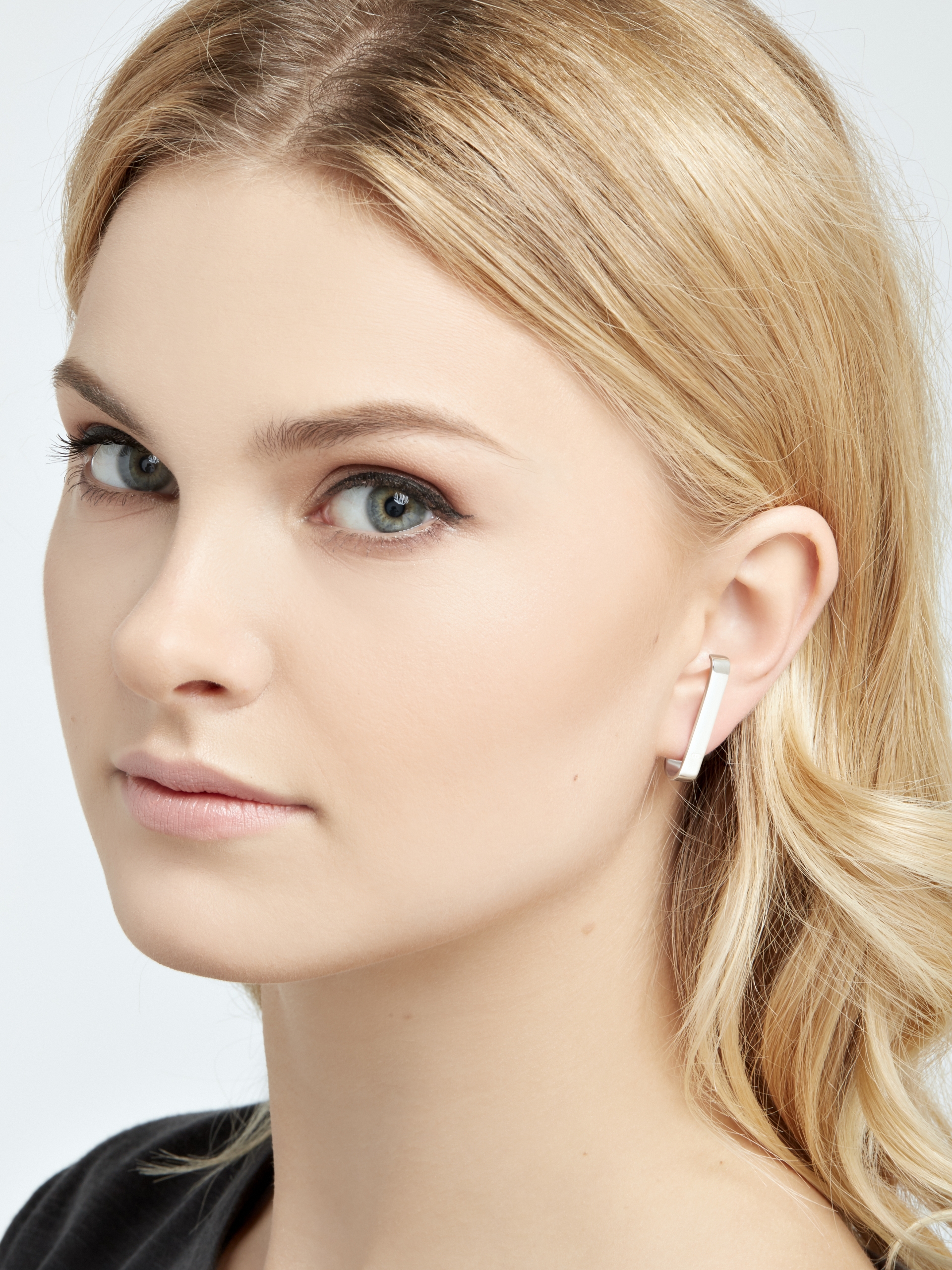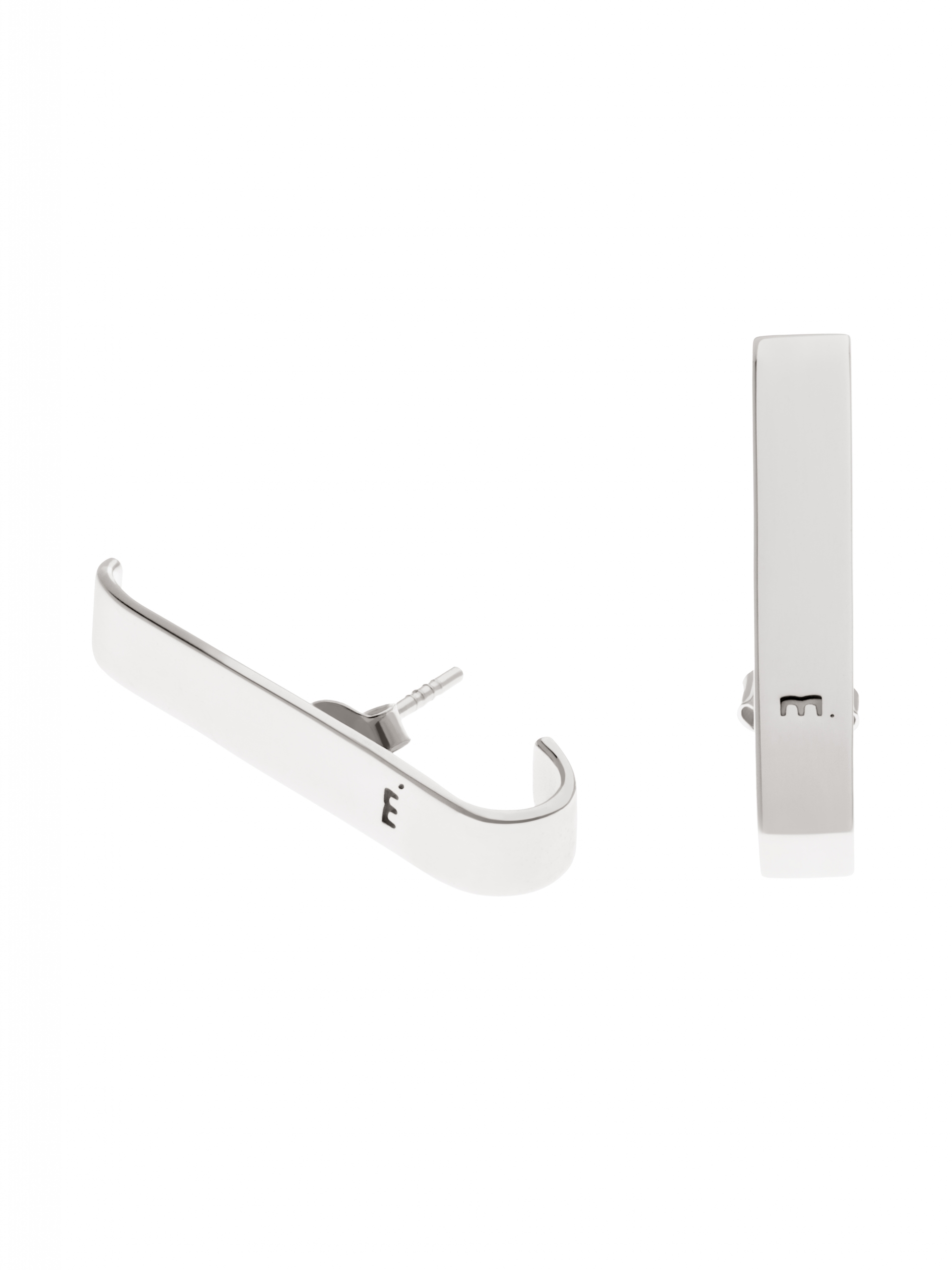 A pair of symmetrical earrings. Earrings give the impression of clips hiding under and in the ear. ‘Moie’ logo is engraved on the front of the earring. Earrings made of sterling silver.
