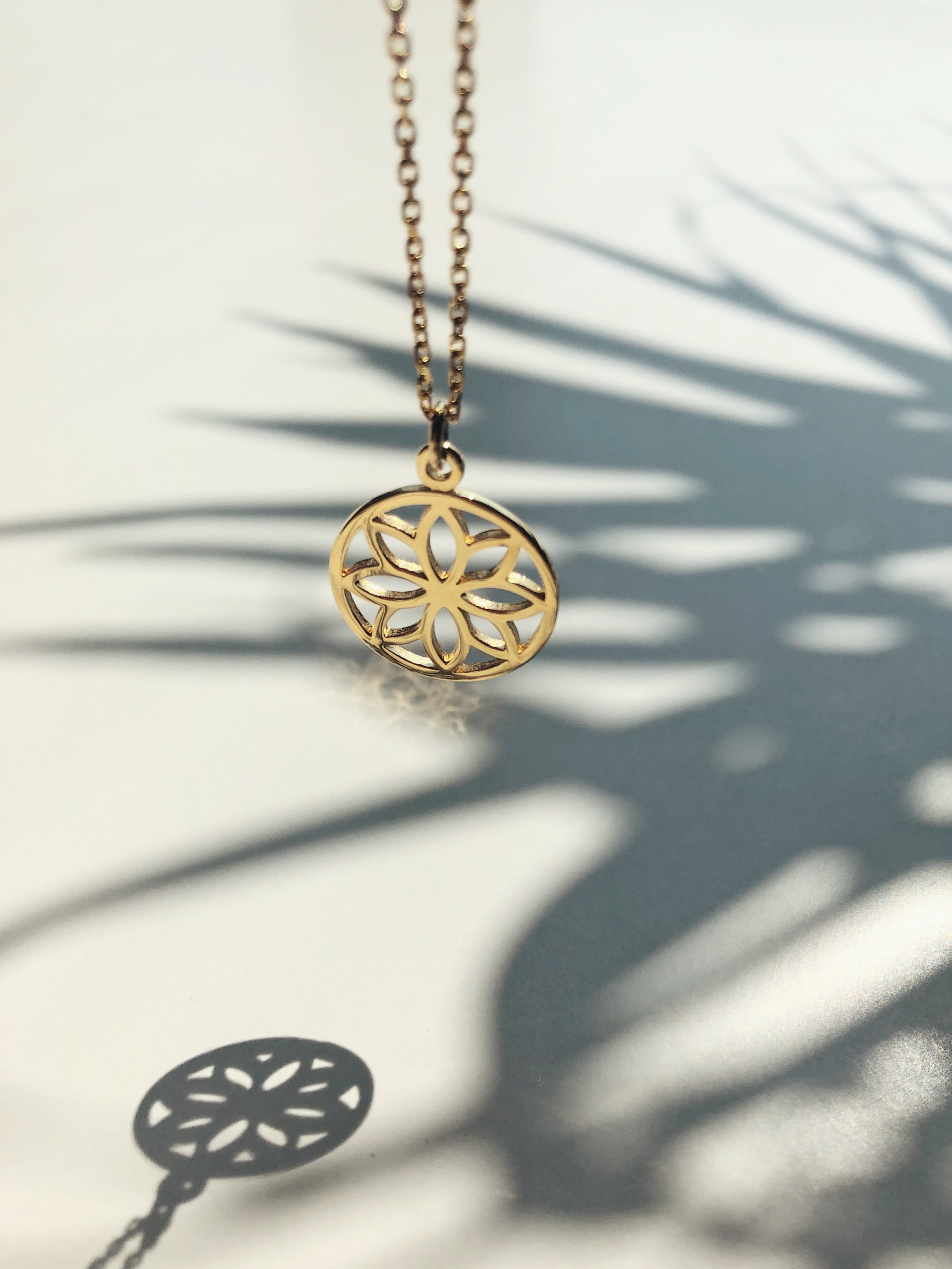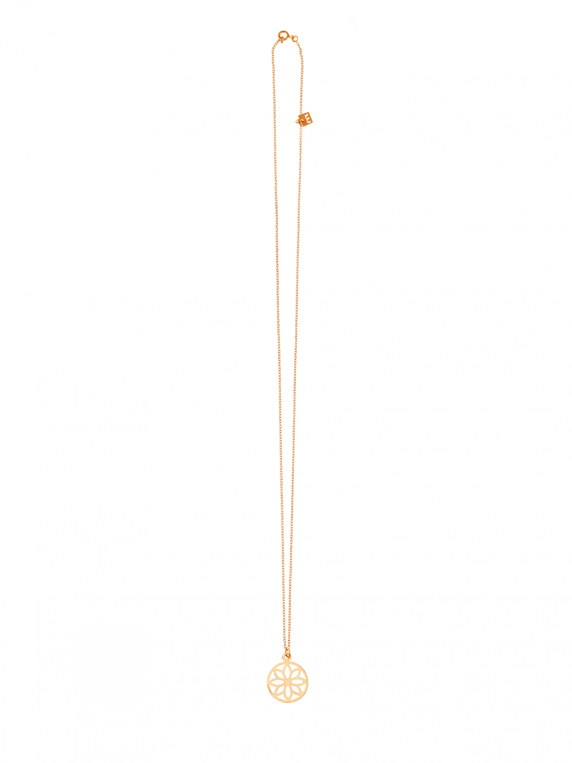 Necklace with a medallion hung on a delicate chain. A medallion is in the form of an openwork motif with a geometric flower. The necklace is available in three sizes due to the length of the chain: size S – 45 cm, size M – 60 cm, size L – 80 cm. Choose the length that suits you best or create a composition with several different designs of medallions in different sizes. The medallion has a diameter of about 2 cm. Necklace is made of Vermeil gold. The model in the picture wears the size S.