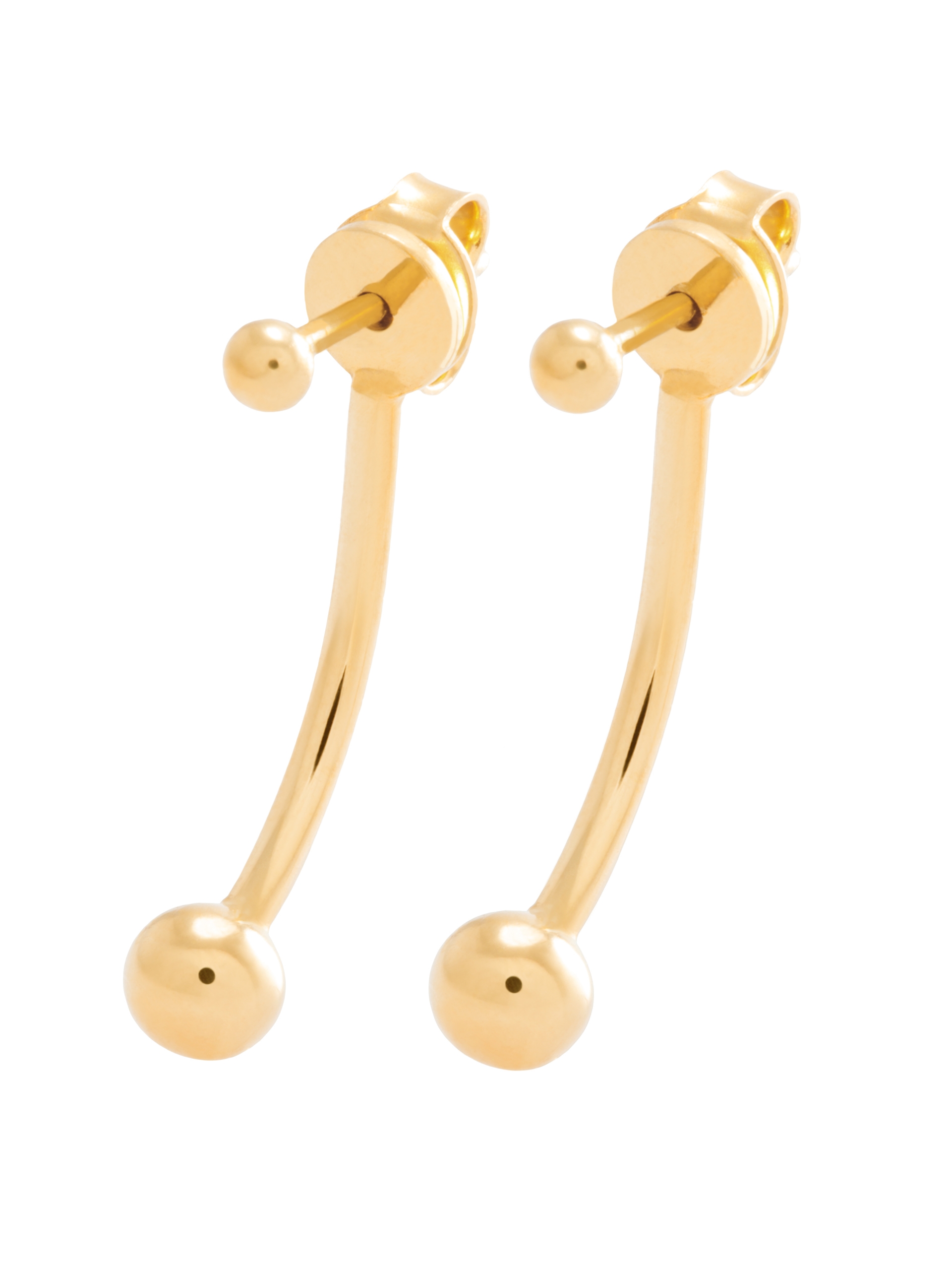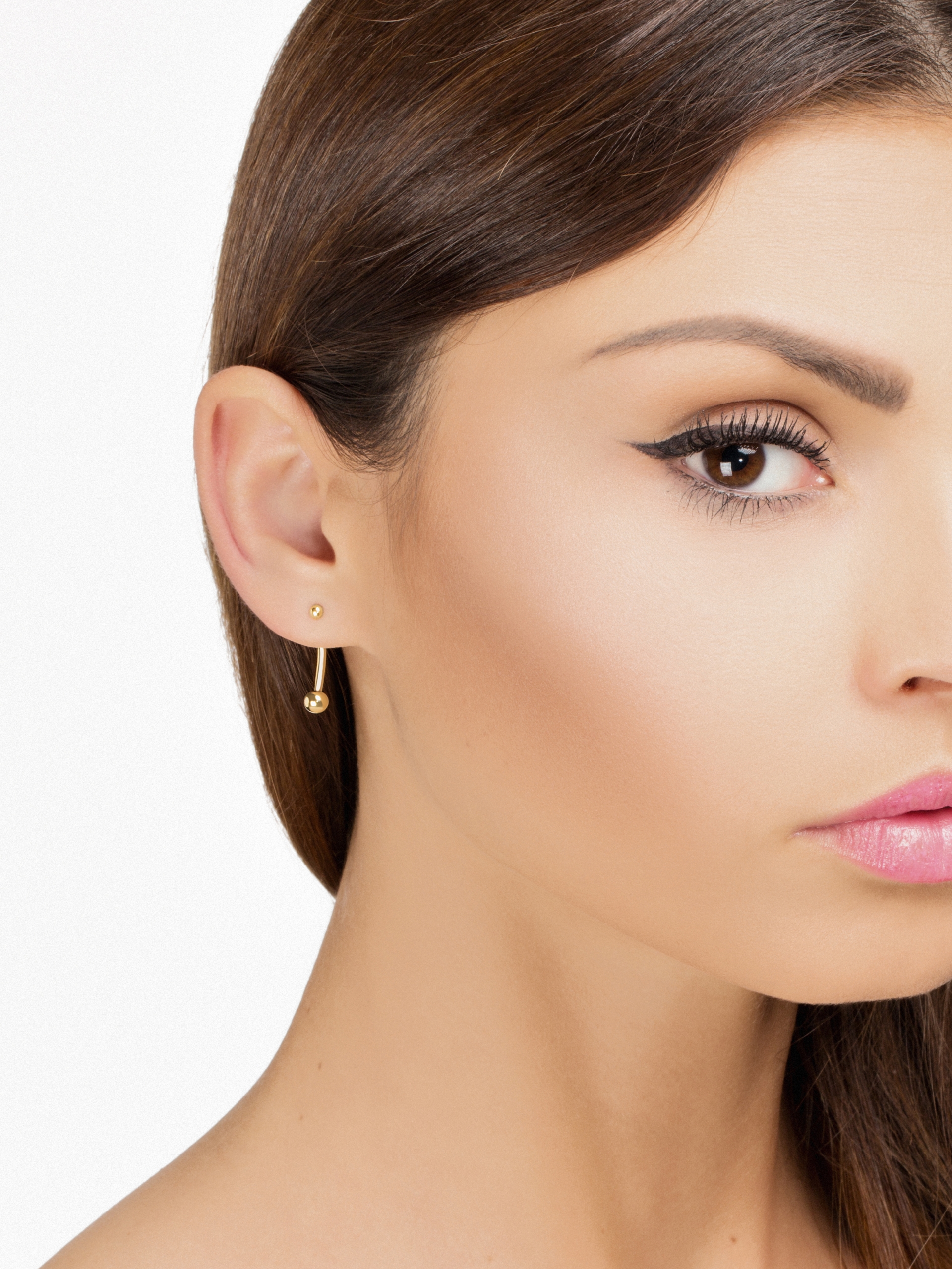 Złote kolczyki kulki składają się każdy z dwóch niezależnych elementów. Kolczyki można przez to nosić na różne sposoby – zakładając oba jednocześnie lub tylko pierwszy z nich który nosi się z przodu ucha. Jedna część to sztyft z kulką, a druga to nóżka zakładana na sztyft od tyłu, która również na zakończeniu ma identyczną kulkę. Z kolczykami świetnie da się również stworzyć asymetrię, zakładając każdy z kolczyków inaczej na obu uszach. Biżuteria ta jest częścią kolekcji Middle Balance. Kolekcja ta to minimalistyczne kuleczki połączone w różne, geometryczne formy, charakterystyczne dla marki Moie. Wymiar każdego ze złotych kolczyków kulek wynosi ok. 2,3 cm. Złote kolczyki kulki wykonane są ze złota Vermeil. Biżuteria ta charakteryzuje się długą żywotnością powłoki złocenia. Złoto idealnie łączy się w kompozycje z dodatkami ze srebra i różowego złota.