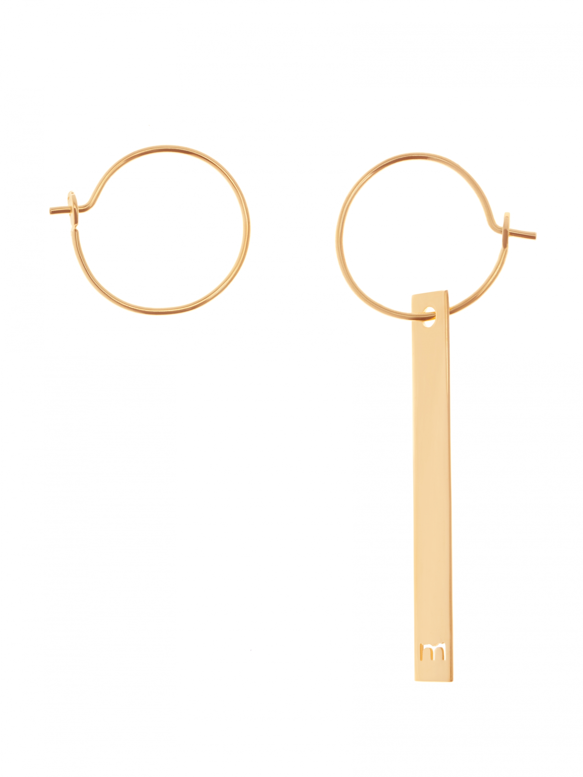 Dodaj do ulubionychAsymetryczne kolczyki kółka, na jednym z kolczyków zawieszona blaszka z wyciętym logo ‘moie’. Wymiar dłuższego kolczyka 4,5cm, wymiar kółeczka 1,5cm. Produkt wykonany ze złota Vermeil.