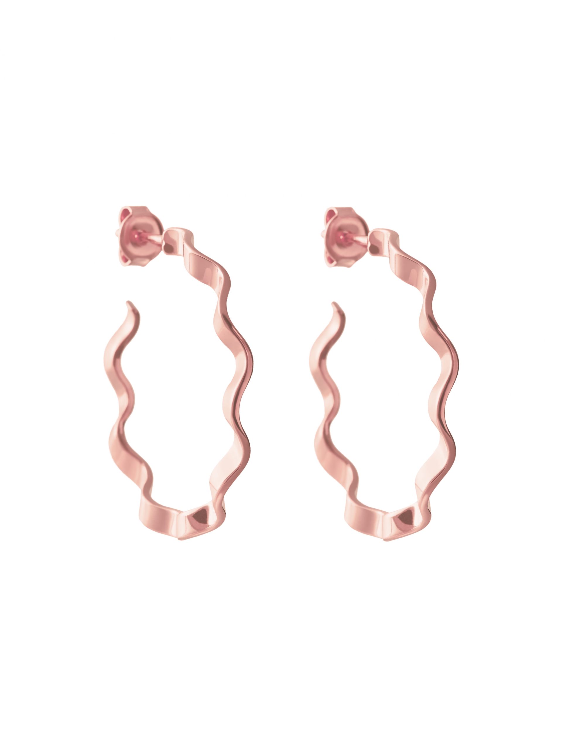 Kolczyki kółka stanowi para symetrycznych kolczyków. Kolczyki mają formę przypominającą łagodne i minimalistyczne fale. Co więcej biżuteria kształtem koła nawiązuje do symbolu odrodzenia, które było natomiast inspiracją do powstania całej kolekcji Reborn. Charakteryzuje je minimalizm typowy dla biżuterii Moie. Kolczyki kółka zapinane są na sztyfty, a ich średnica wynosi ok. 3 cm. Produkt wykonany jest z różowego złota Vermeil. Biżuteria ta charakteryzuje się długą żywotnością powłoki złocenia. Kolczyki kółka przez swoją falującą formę pięknie odbijają światło, sprawdzą się zatem idealnie zarówno do dziennych jak i wieczorowych stylizacji. Różowe złoto idealnie łączy się w kompozycje z dodatkami ze srebra i złota. Produkt ten dostępny jest również w srebrze i złocie Vermeil.