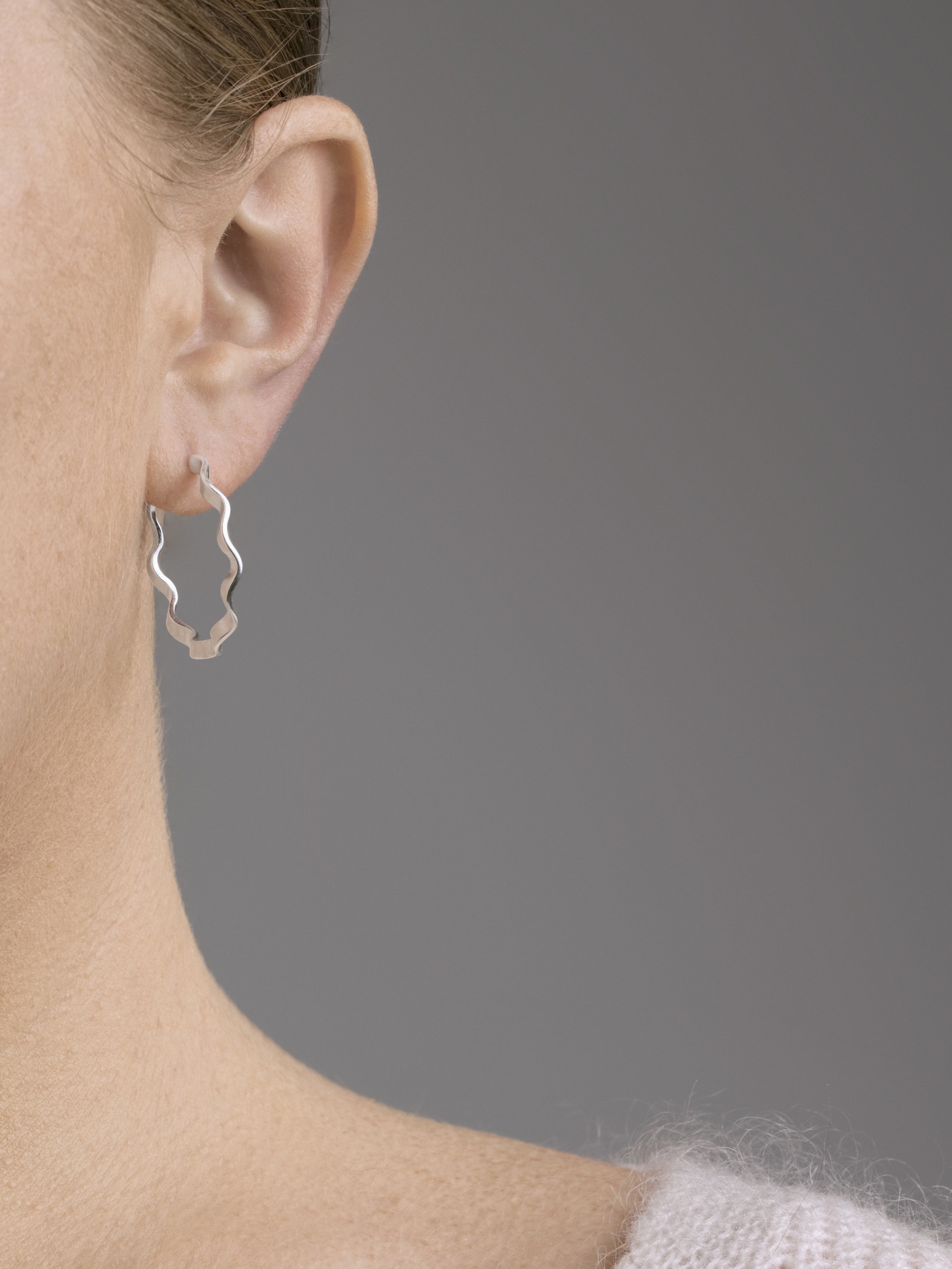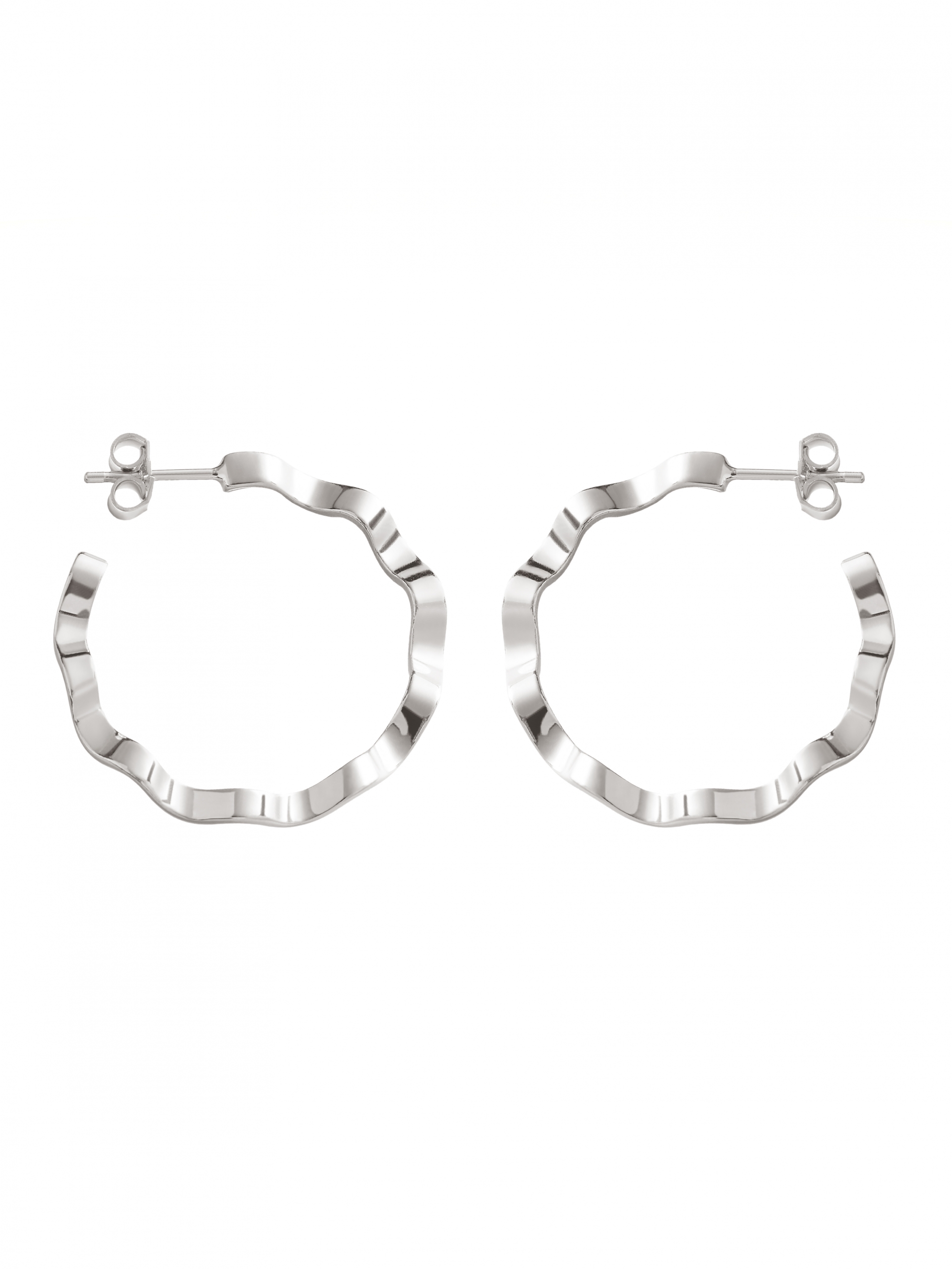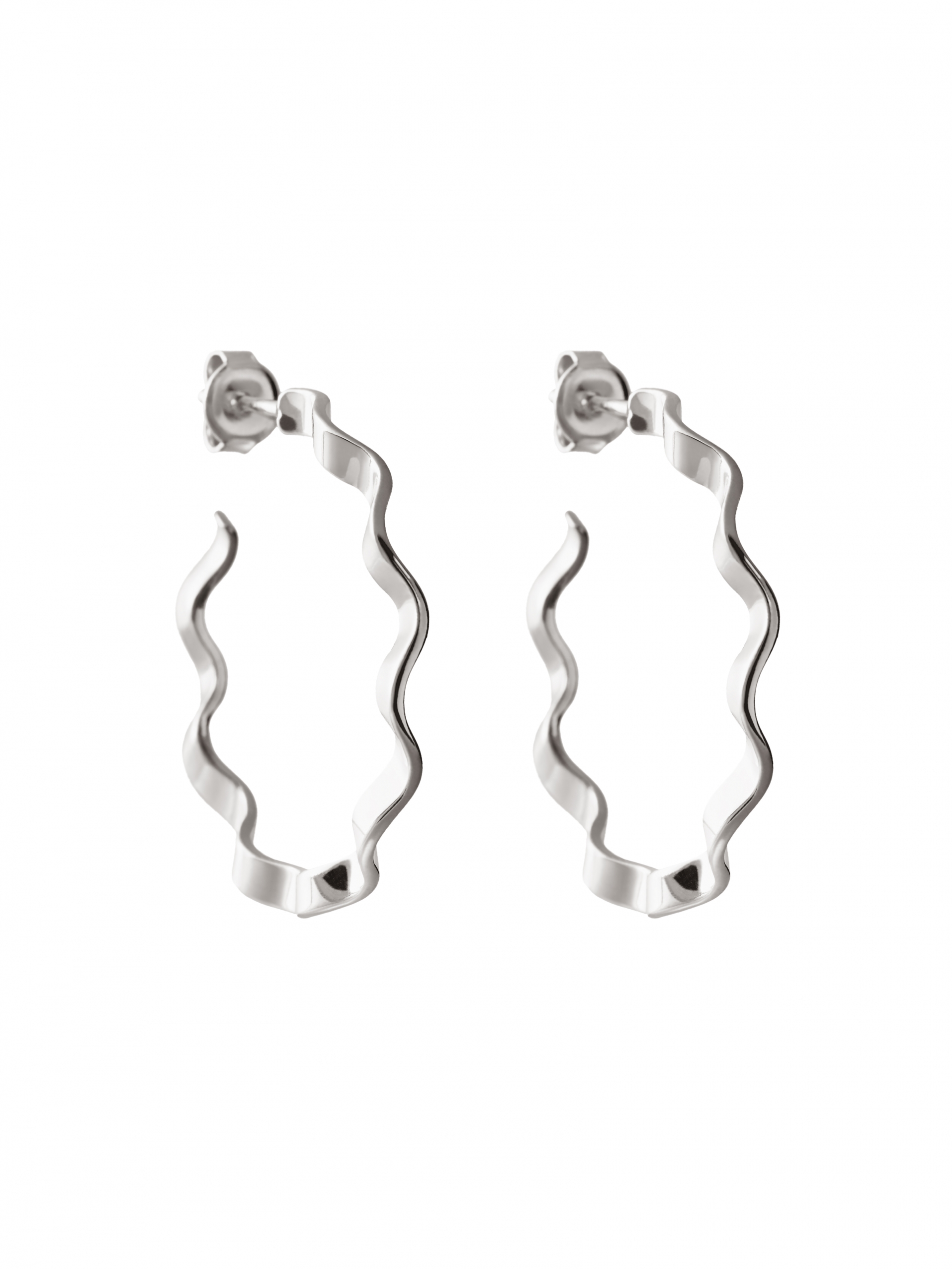 Srebrne kolczyki kółka stanowi para symetrycznych kolczyków. Kolczyki mają formę przypominającą łagodne i minimalistyczne fale. Co więcej biżuteria kształtem koła nawiązuje do symbolu odrodzenia, które było natomiast inspiracją do powstania całej kolekcji Reborn. Charakteryzuje je minimalizm typowy dla biżuterii Moie. Srebrne kolczyki kółka zapinane są na sztyfty, a ich średnica wynosi ok. 3 cm. Produkt wykonany jest ze srebra próby 925. Kolczyki przez swoją falującą formę pięknie odbijają światło, sprawdzą się zatem idealnie zarówno do dziennych jak i wieczorowych stylizacji. Ponadczasowe i klasyczne srebro idealnie łączy się w kompozycje z dodatkami ze złota i różowego złota. Produkt ten dostępny jest również w złocie i różowym złocie Vermeil.