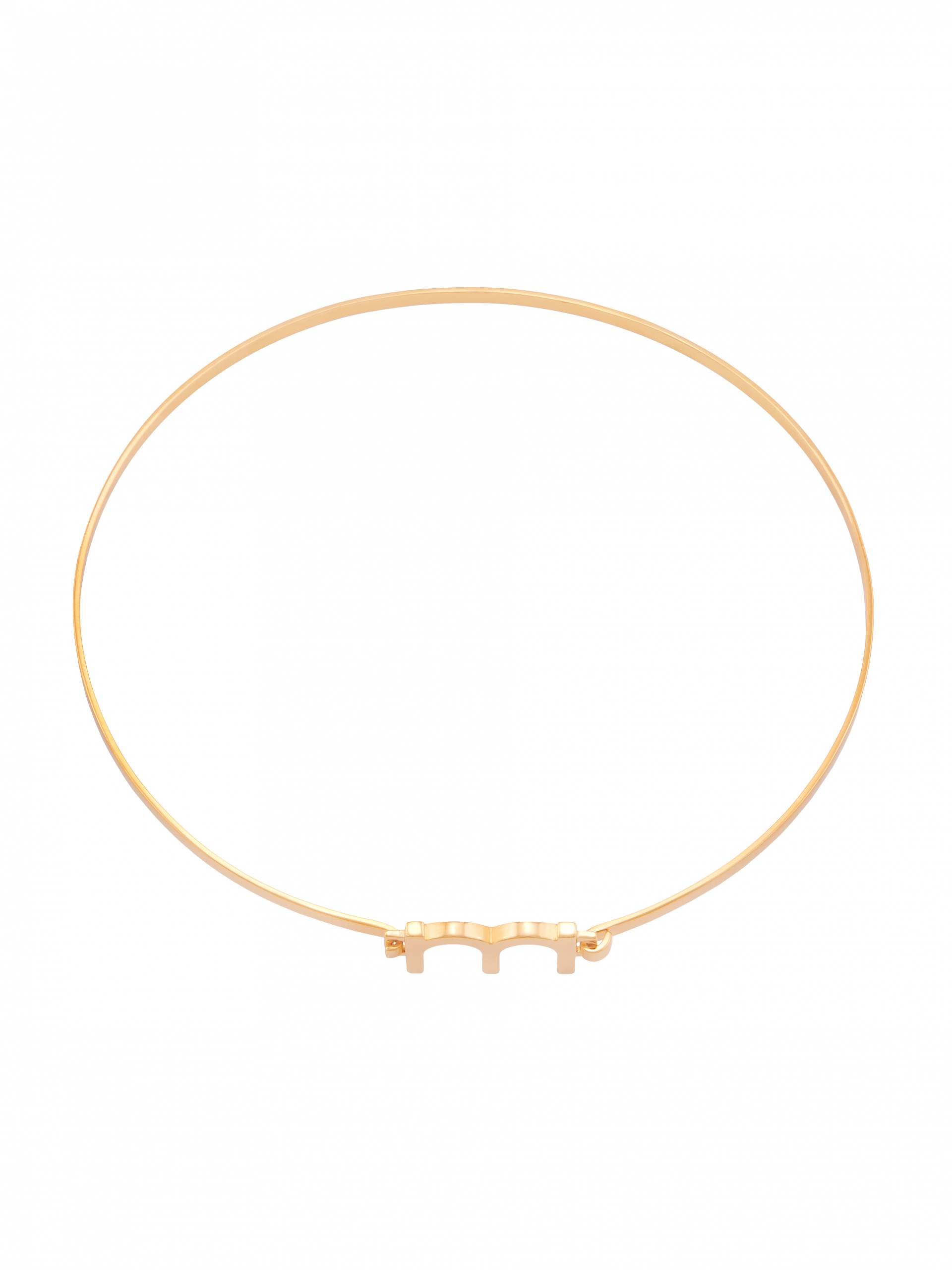 Naszyjnik – choker w formie obręczy z logotypem ‘moie’. Obręcz zapinana jest w łatwy sposób przy logotypie. Choker występuje w dwóch rozmiarach. Rozmiar S – obwód szyi 33cm, rozmiar M – obwód szyi 36cm. Wysokość ‘m’: ok 1,5cm. Produkt wykonany jest ze złota Vermeil.