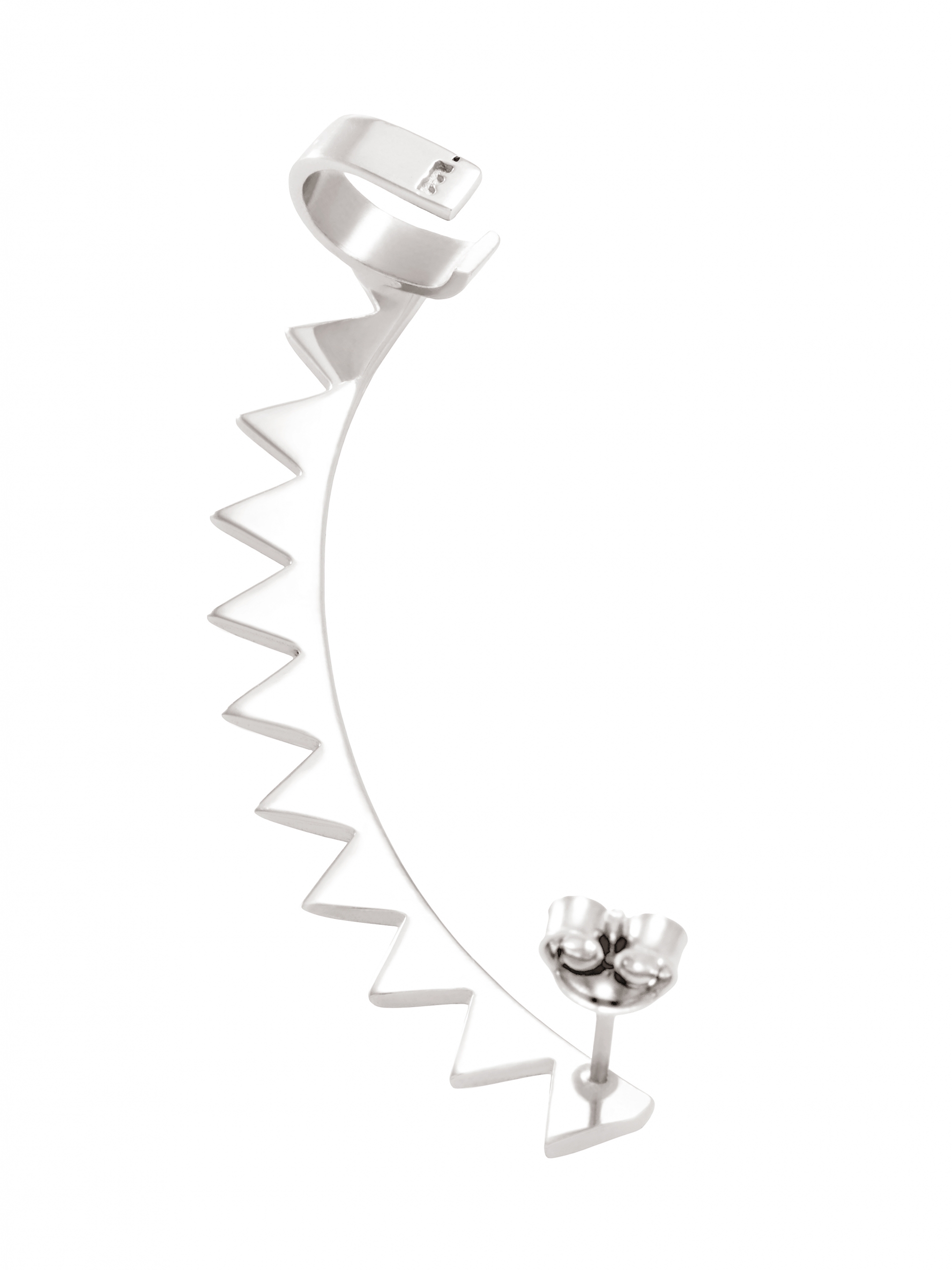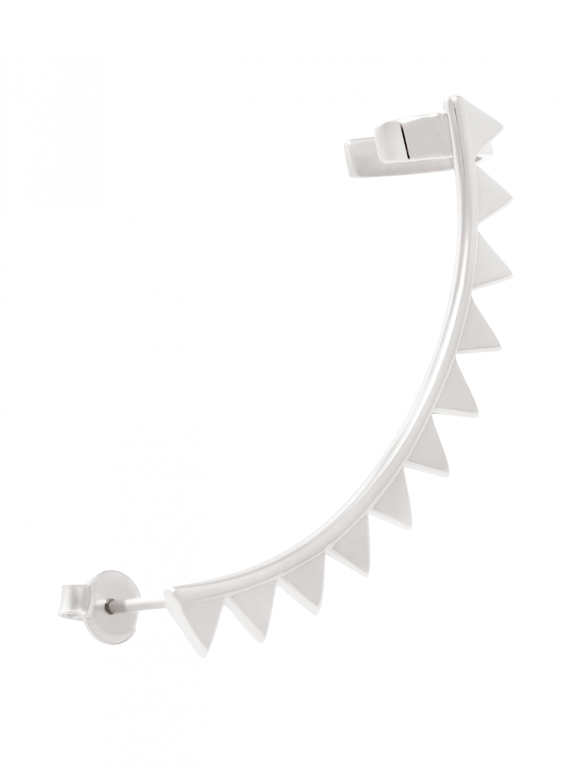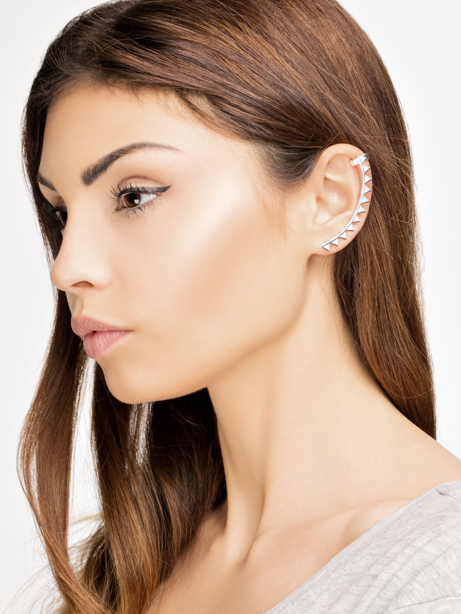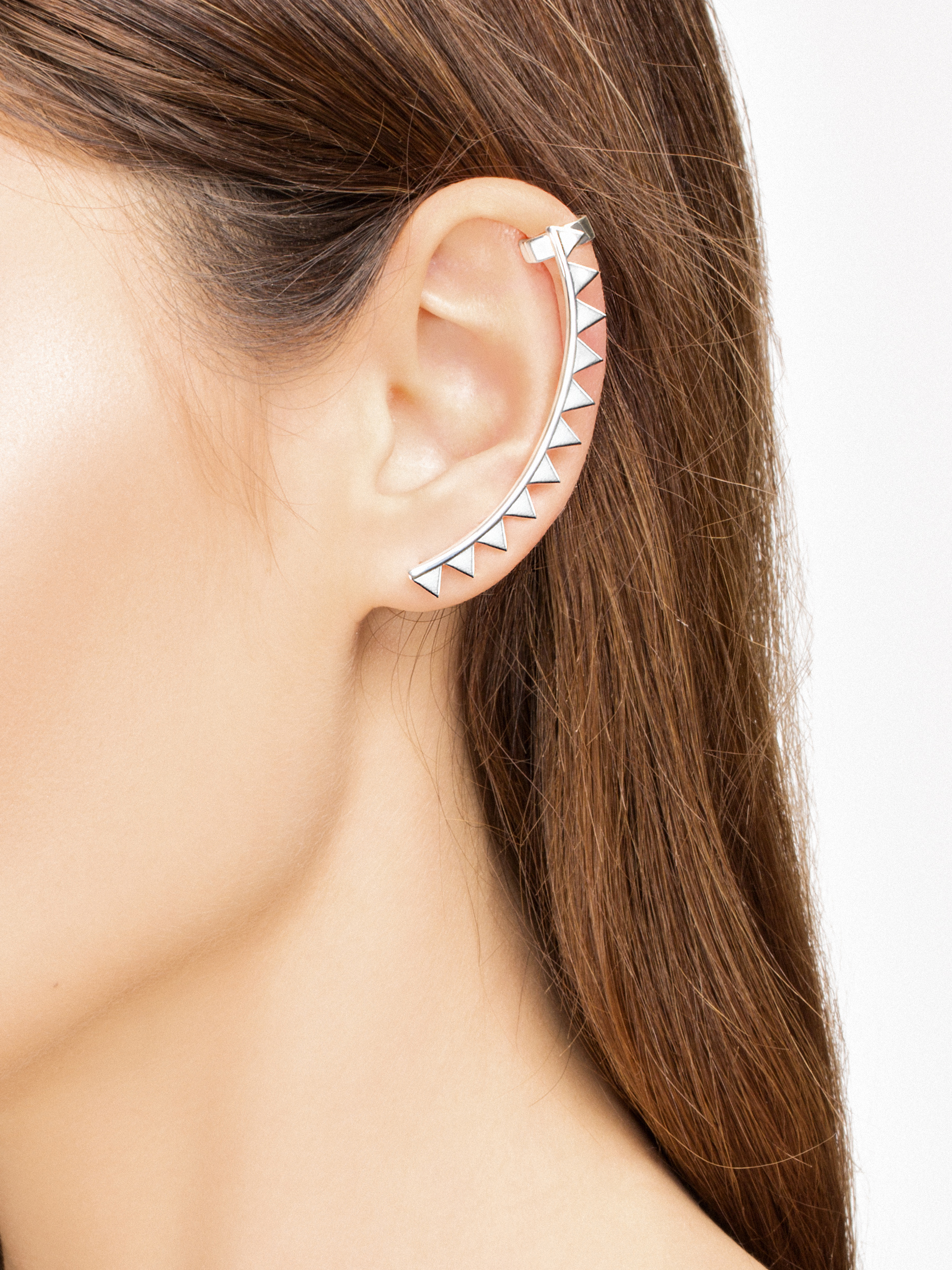 Nausznica z trójkącikami ozdabiająca całe ucho. Nausznica posiada sztyft z zapięciem i klips utrzymujący biżuterię prawidłowo na uchu. Nausznica dostępna w wariancie na lewe lub prawe ucho. Wymiar: 5 cm. Produkt wykonany ze srebra 925