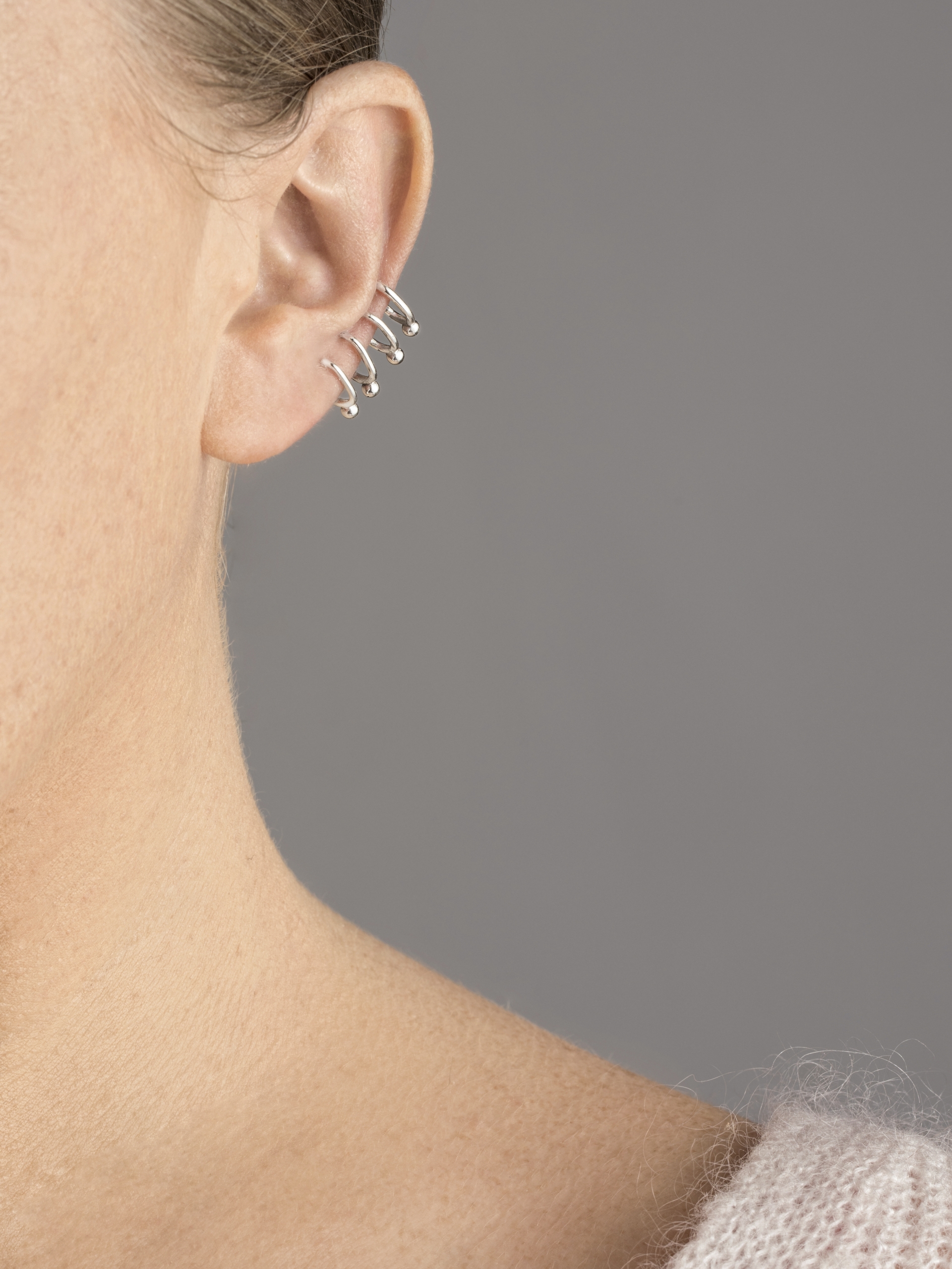 Złota nausznica kolczyk do noszenia zarówno na lewe i prawe ucho. Nausznica składa się z połączonych w jeden spójny kształt kółek z ozdobnymi kuleczkami. Nausznica sprawia zatem wrażenie kilku kolczyków założonych na ucho jednocześnie. Produkt ten jest częścią kolekcji Reborn. Nausznicę charakteryzuje minimalizm typowy dla biżuterii Moie. Złota nausznica kolczyk stanowi asymetryczną ozdobę na jedno ucho. Aby nosić ozdobę symetrycznie na obu uszach, należy zakupić dwie sztuki nausznic. Wymiar całej nausznicy wynosi ok. 2,5 cm. Produkt ten wykonany jest ze złota Vermeil. Biżuteria ta charakteryzuje się długą żywotnością powłoki złocenia.
