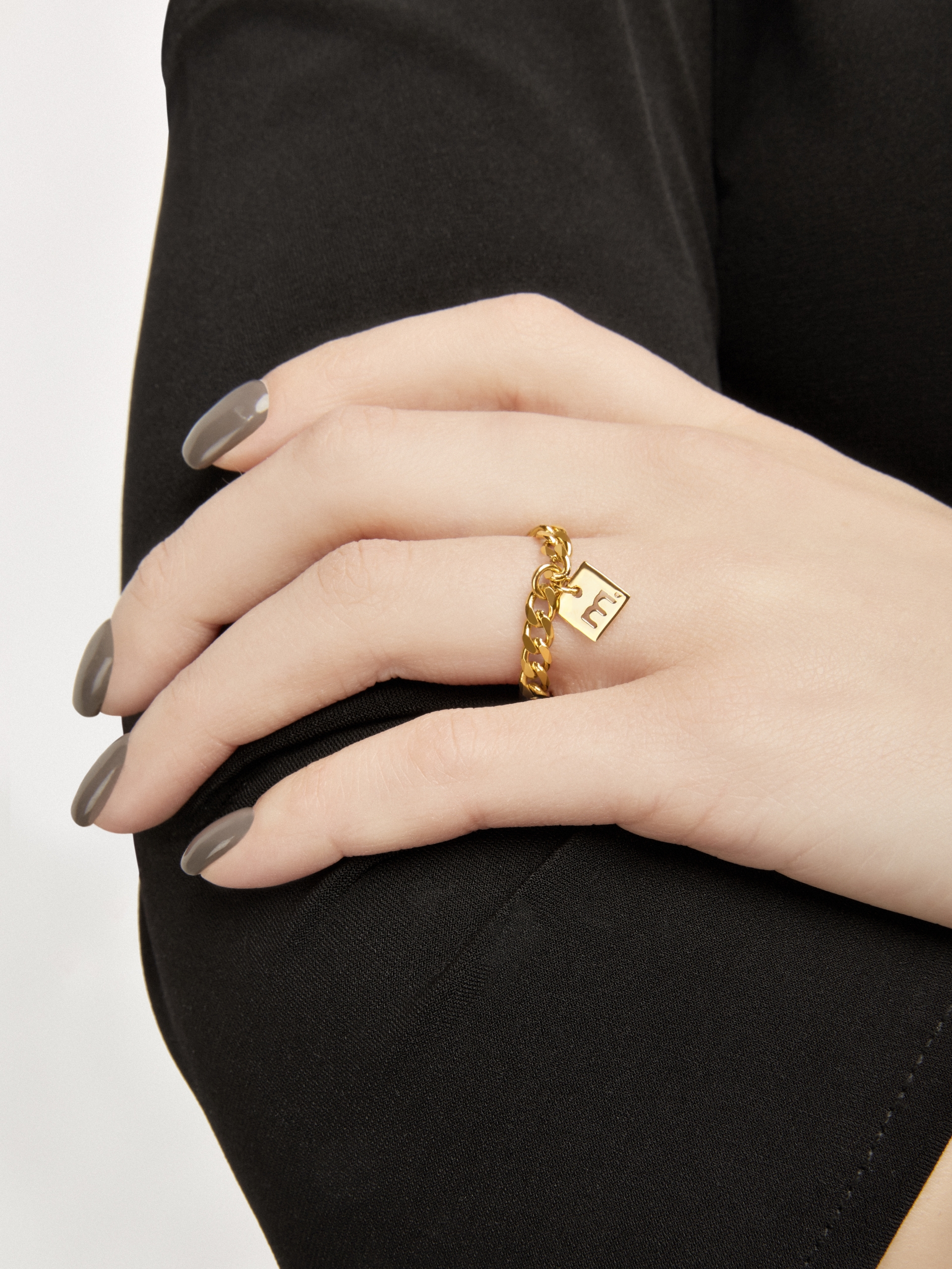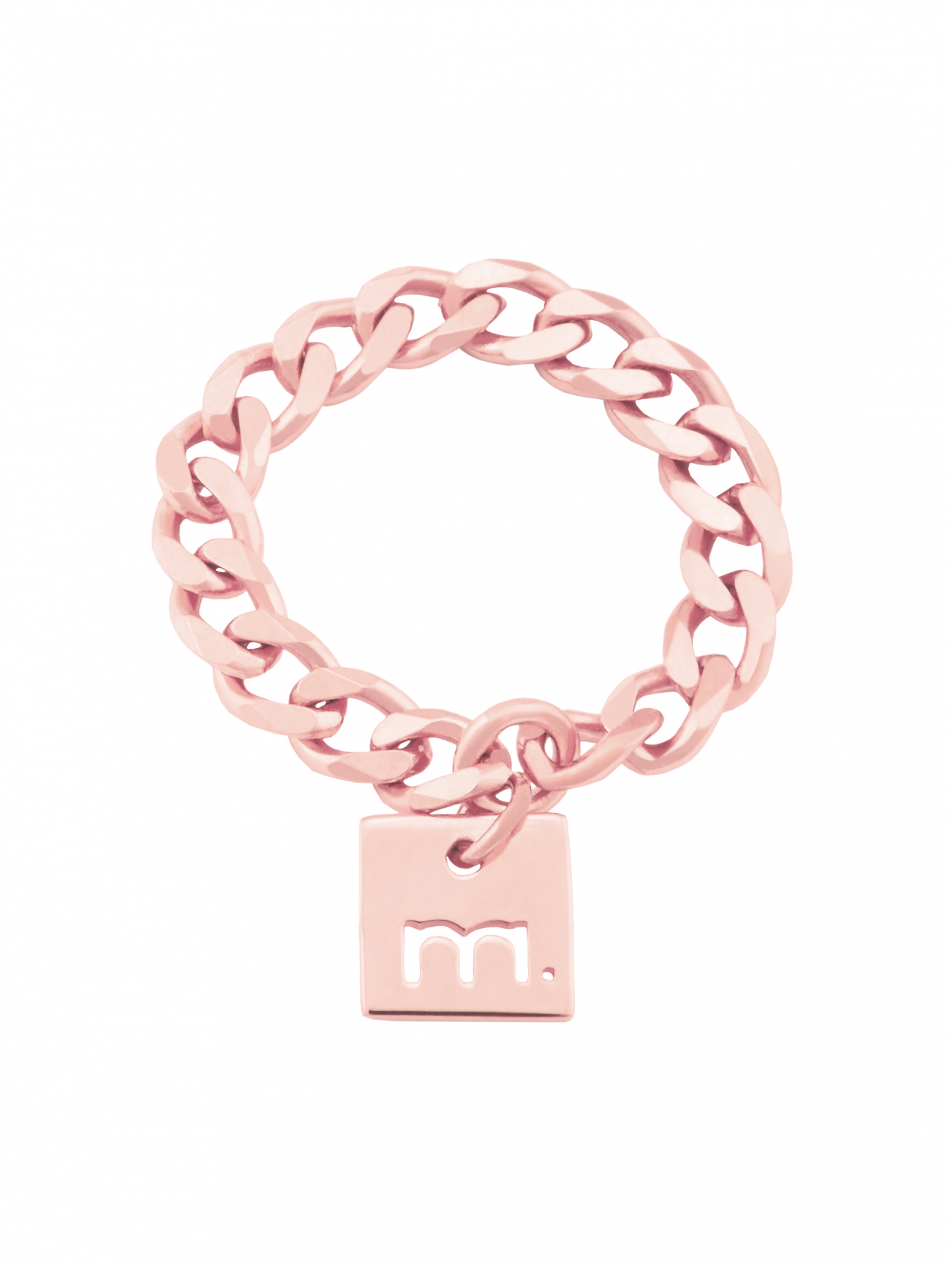 Pierścionek łańcuszek. Biżuteria składa się z grubego łańcuszka i założonej na niego metki z logo Moie. Łańcuszek, z którego zrobiony jest pierścionek nie jest usztywniony, a jego kształt dopasowuje się do kształtu palca. Produkt ten jest częścią kolekcji Moie Essentials. Kolekcja ta to minimalizm w biżuterii ponad wszystko, czyli to co w Moie kochamy najbardziej. Pierścionek łańcuszek jest dostępny w różnych rozmiarach, możesz nosić go w dowolny sposób lub łączyć kilka pierścionków ze sobą. Wymiar metki założonej na pierścionek wynosi ok. 0,7 cm. Produkt ten wykonany jest z różowego złota Vermeil. Biżuteria ta charakteryzuje się długą żywotnością powłoki złocenia. Produkt ten dostępny jest również w srebrze i złocie i znajduje się tutaj.